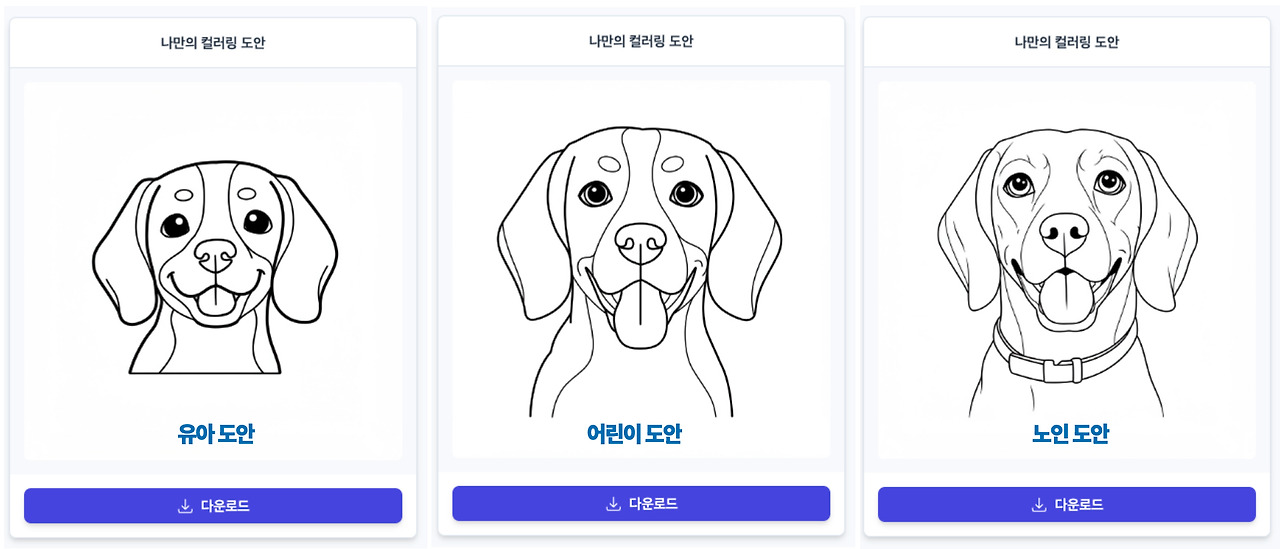 이렇게 완성된 AI 컬러링북 생성기를 실제로 실행해보니, 정말 놀라웠어요. 복잡한 설정 없이도 원하는 사진 하나만 업로드하면 되더라고요. 게다가 그림을 색칠할 대상에 따라 '유아', '어린이', '어른', '노인'을 선택할 수 있어서, 각자에게 맞는 난이도로 도안이 만들어지는 것도 좋았어요. 유아용은 굵고 단순한 선으로, 어른용은 섬세하고 복잡한 디테일까지 살려 변환해주는 걸 보며 AI의 성능에 놀라지 않을 수 없었어요.