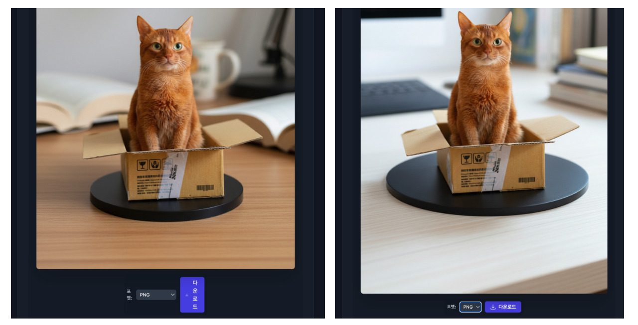 이번에는 잘 수정되었을까요? 아쉽게도 이미지의 크기는 이전과 동일하게 크게 생성되었고, 다운로드하기 위한 이미지 포맷과 다운로드 버튼이 제대로 표시되지 않았네요(아래 왼쪽). "포맷"과 "다운로드" 버튼의 올바른 수정을 위해서 해당 부분을 이미지 캡처하고 프롬프트에 추가하여 아래와 같이 재 수정을 요청하는 프롬프트를 작성하고 다시 수행하였습니다. 수행결과 포맷과 다운로드 버튼은 올바르게 표시되었지만, 이미지 크기는 여전히 변경이 되지 않았습니다(아래 오른쪽).