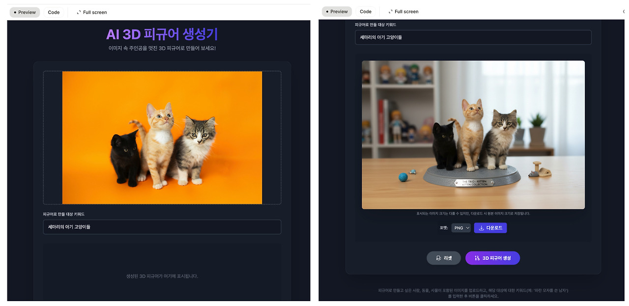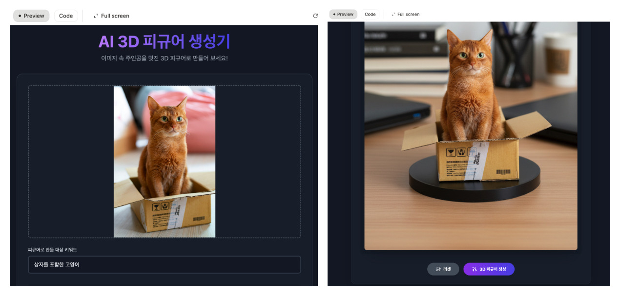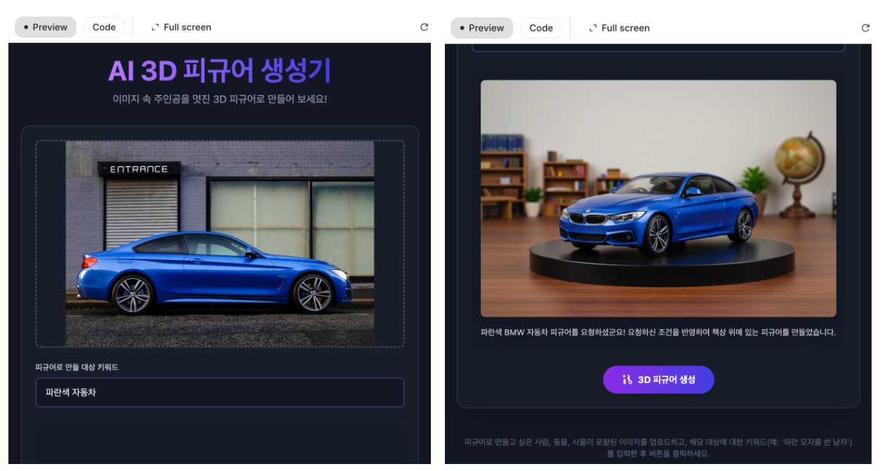 생성된 애플리케이션의 모습을 다음과 같습니다. 3가지 형식의 이미지를 업로드하고, 이미지에서 3d 피규어를 만들 대상을 입력한 후, "3D 피규어 생성" 버튼을 클릭하면 "나노 바나나" 모델을 사용해서 멋진 3D 이미지가 생성됩니다. 아래의 예시를 참조해 주세요.