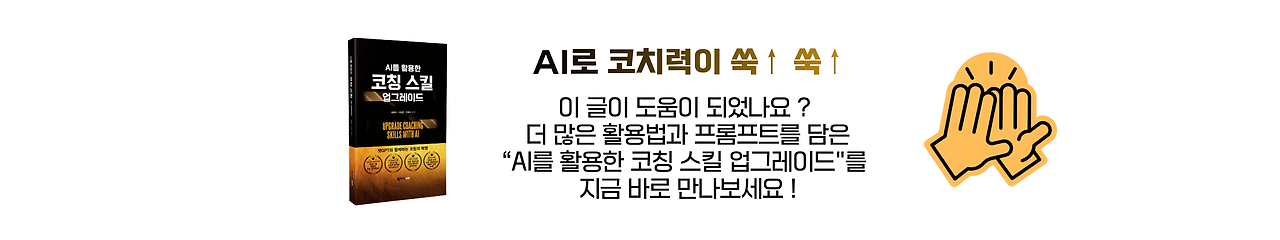 이처럼 코칭 여정에서 AI를 활용한 학습은 좋은 보조 수단이 될 수 있습니다. 하지만 가장 중요한 것은 실제 코칭 경험을 쌓고, 피드백을 받으며 자신만의 코칭 스타일을 발전시켜 나가는 것임을 잊지 마세요. 코치로서의 성장은 실제 코칭 관계 속에서 이루어집니다. 챗GPT를 자신의 코칭 여정에서 어떻게 활용할지 코치로서의 새로운 생각과 관점이 이제 필요할 것 같네요.
