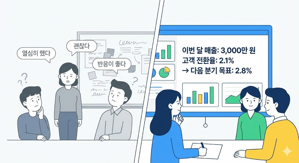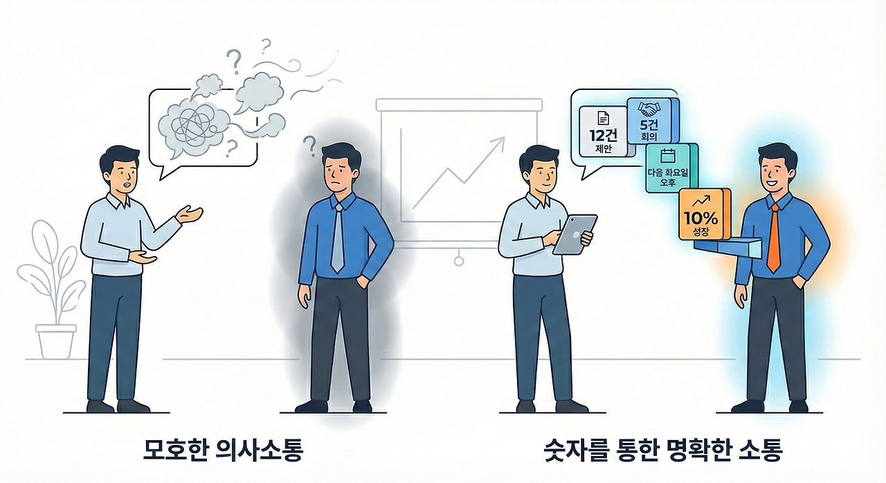 그런데 숫자는 다릅니다. 물론 숫자에도 맥락이 필요하지만, 적어도 “어느 정도인지”를 함께 가늠하거나 볼 수 있게 해줍니다. 한 예로, “매출이 꽤 나왔어요”라는 말 대신, “이번 달 매출은 3,000만 원이고, 고객 전환율은 2.1%이며, 이 수치를 다음 분기 말까지 2.8%로 끌어올리는 것이 목표입니다”라고 말하면 전달되는 메시지는 완전히 달라집니다. 절대값(매출), 변화의 크기(퍼센트), 그리고 시간의 기준(언제까지)이 함께 제시되는 순간, 대화는 자연스럽게 다음의 질문과 합의로 이어집니다. 왜 이 수치인가, 그 기간 안에 가능한가, 다음 단계는 무엇인가—대화의 초점이 상황이나 현상의 ‘이해/파악’에서 이제 ‘결정’으로 이동하게 됩니다. 비즈니스에서의 가장 원하는 결과에 다다르게 됩니다.