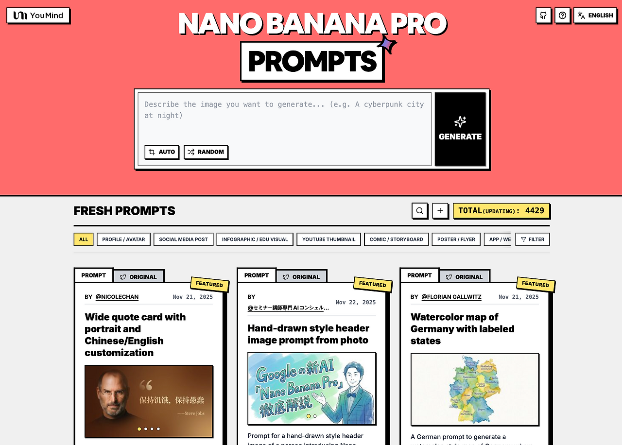 YouMind는 "학습(리서치·정리)과 창작(글·이미지·오디오 등)을 한 워크스페이스에서 통합적으로 운영"한다는 콘셉트의 SaaS 서비스입니다. 특히 Nano Banana Pro 프롬프트 작성을 돕기 위해 별도로 운영하는 'Nano Banana Pro Prompts' 페이지가 꽤 유용한데요. 4,200개가 넘는 프롬프트 예시를 지속적으로 업데이트하는 형태로 제공하고 있습니다. 이 페이지의 예시들은 주로 외부 SNS(특히 X/Twitter 등)에 게시된 사례를 큐레이션해 포털처럼 모아 보여주는 방식에 가깝고, 각 예시에는 원문을 확인할 수 있는 'Prompt Original'(원문 링크/원문 프롬프트) 섹션이 함께 제공됩니다. 주목할 점은 프롬프트를 그대로 복사해 쓰는 데서 끝나지 않는다는 점입니다. 문구·이름·인용문처럼 일부 텍스트를 바꿔가며 재사용하기 좋도록, 파라미터 형태의 입력칸을 제공해 "내 상황에 맞게 빠르게 프롬프트를 변형"하는 감각을 익히는 데 도움을 줍니다. 참고로 YouMind는 크레딧 기반 플랜으로 운영되며, 무료 플랜에도 월 2,000 크레딧이 포함된 것으로 안내되어 있습니다. 이를 활용하면 'Try it now'처럼 바로 생성 흐름으로 넘어가는 기능을 직접 실행해 볼 수 있고, 프롬프트 사례 자체는 페이지에서 무료로 열람 가능합니다.