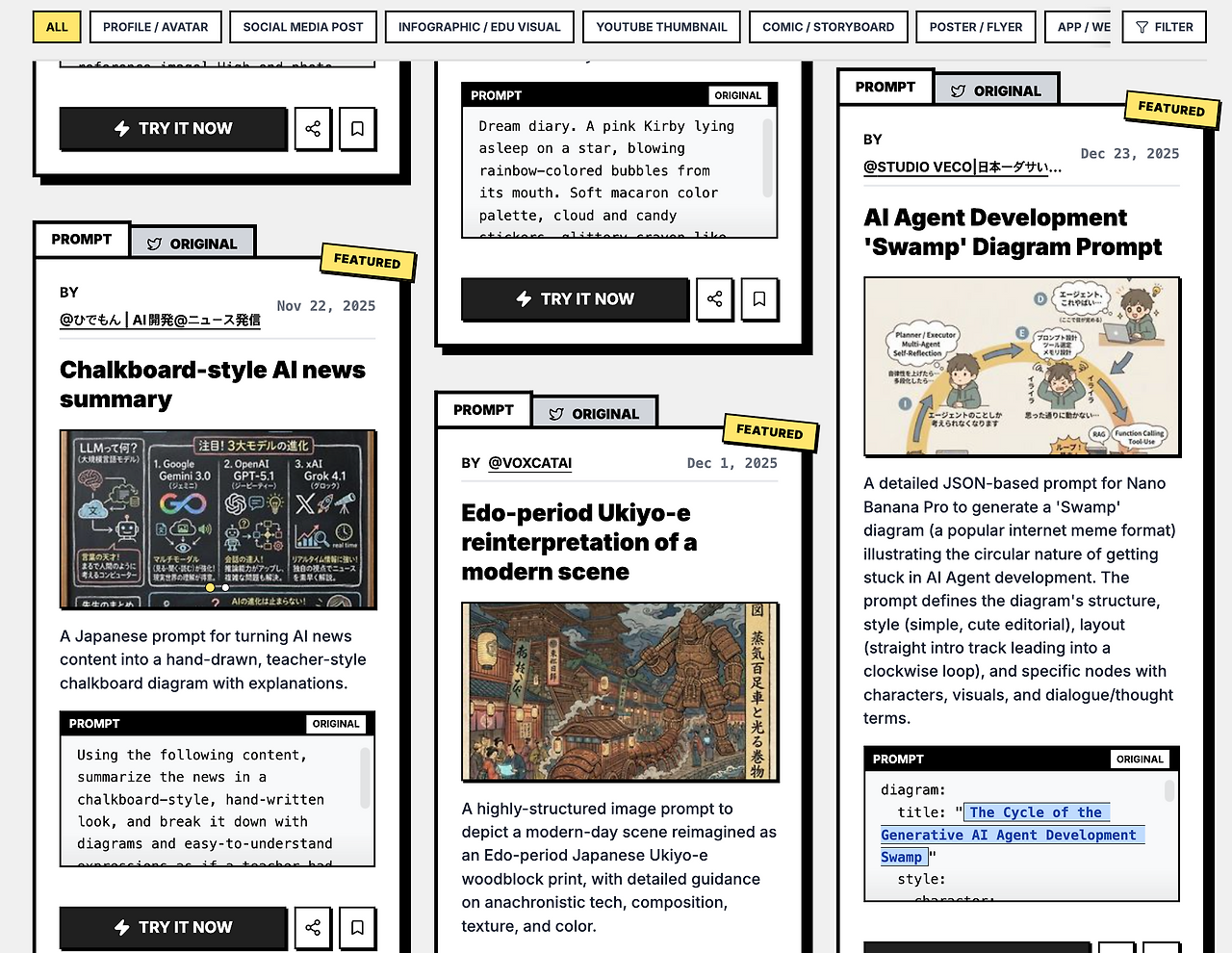 프롬프트를 입력해 실생활이나 업무에 바로 사용해 볼 수 있는 다양한 예시들을 살펴볼 수 있습니다. 특히 펜으로 쓴 노트 이미지는 정말 사람이 직접 적은 것처럼 자연스럽네요. 도식화, 포스터, 설명이 포함된 도면, 인포그래픽, 미니어처 사진 같은 결과물도 꽤 탄탄해서 마케팅 자료나 강의 슬라이드에 충분히 활용할 수 있을 것 같습니다. 신문이나 종이 질감의 이미지 디테일이 사실적이라, 레트로한 분위기의 콘텐츠나 브랜딩용 비주얼, 자료 표지·배경 등 다양한 용도로 응용하기 좋겠다는 생각이 들었습니다. 특히 각 프롬프트를 가독성, 계층 구조, 일관성, 분위기, 테마 적합성 등 5가지 항목으로 나눠 10점 만점으로 평가하니, 품질이 좋은 프롬프트를 빠르게 선별할 수 있어 정말 좋네요. 개인적으로 만들어 보고 싶은 이미지 유형도 다양해서, 앞으로도 매우 유용하게 활용할 수 있을 것 같습니다.