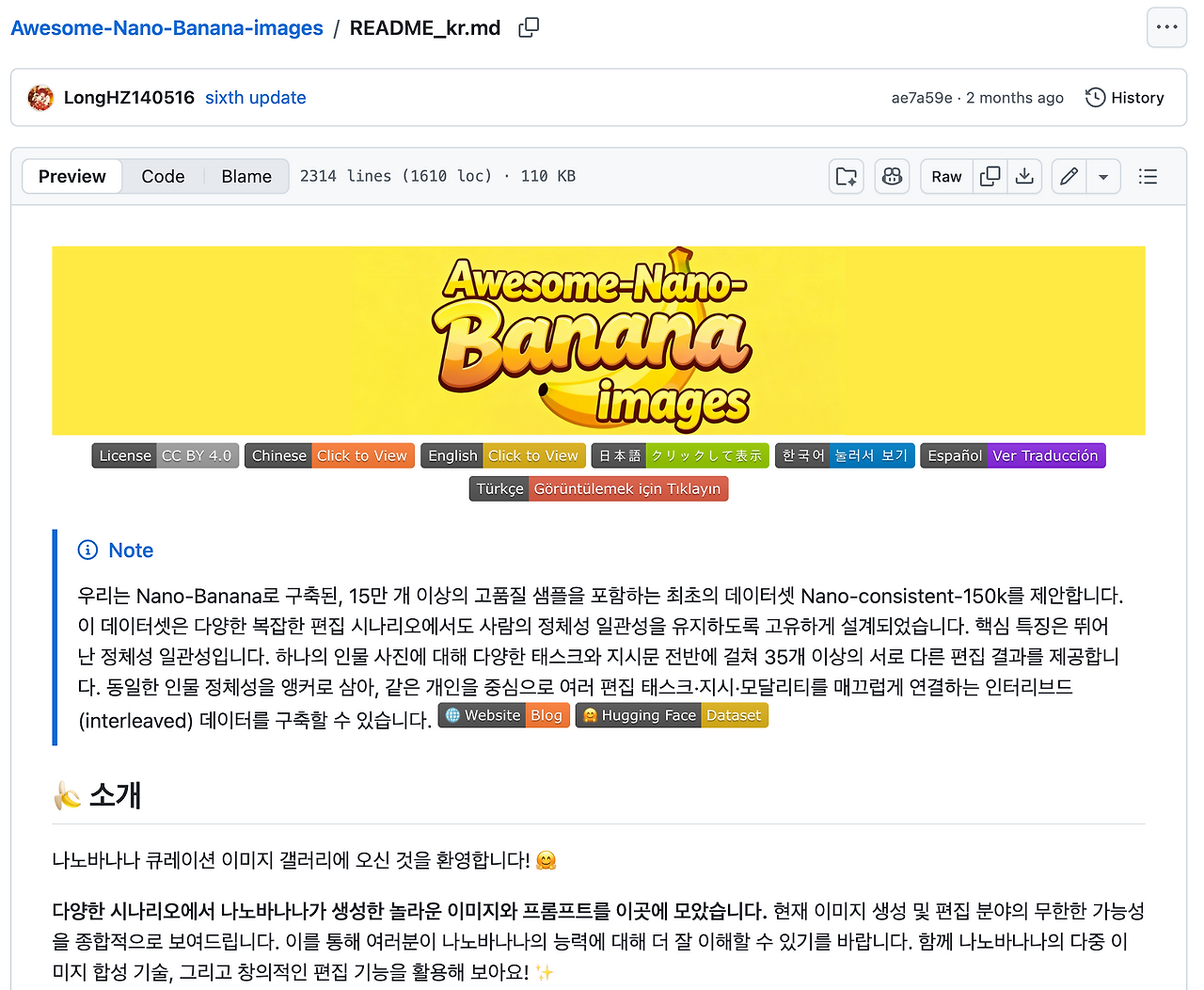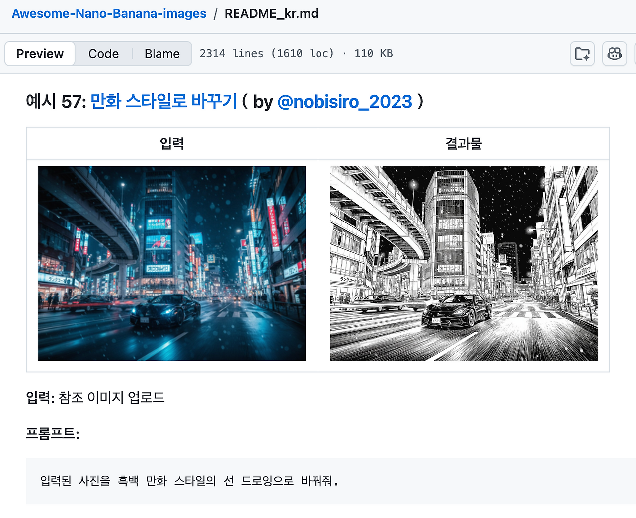 110개의 나노바나나 활용 사례와 함께, 바로 써볼 수 있는 한글 프롬프트를 직접 확인할 수 있습니다. GitHub 페이지로 잘 정리돼 있어 앞으로도 꾸준한 업데이트가 기대되고요. 현실감 있는 사진부터 일러스트, 카툰까지 다양한 스타일의 이미지를 어떻게 생성하고 변환할지 아이디어를 얻는 데 큰 도움이 됩니다.