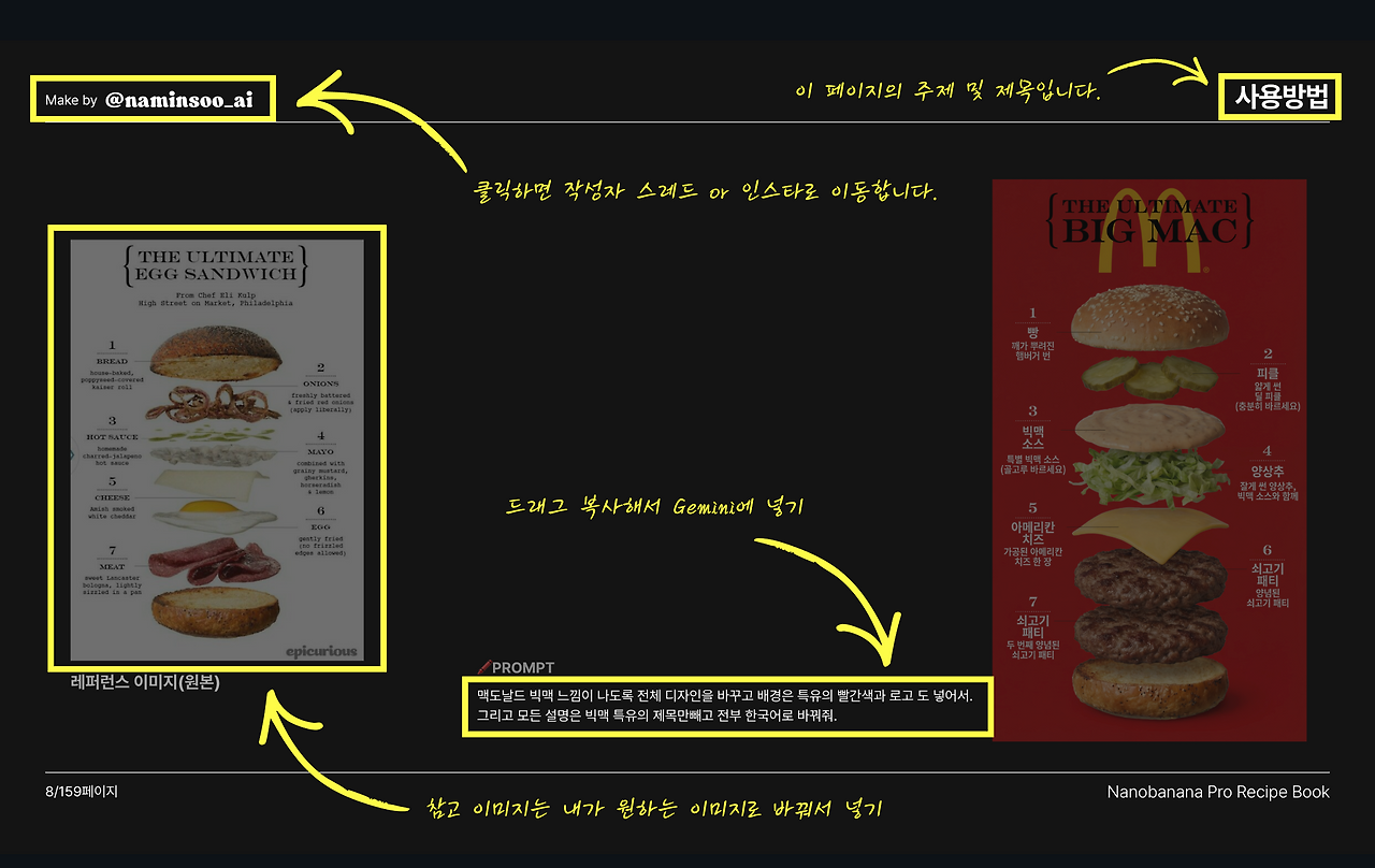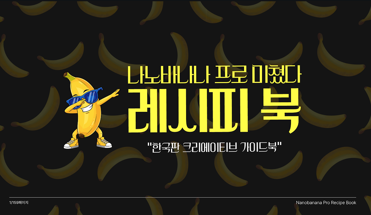 국내에서 Canva로 제작된 나노바나나 프로용 레시피 북으로, 총 159페이지 분량으로 구성돼 있습니다. 디자인·그래픽 분야에서 잘 알려진 분들이 참여했고, 무엇보다 나노바나나 프로를 실제로 활용할 때 참고할 만한 사례와 예시가 풍부해서 내용이 꽤 알찹니다. 웹사이트나 Canva에서 바로 내용을 확인할 수 있다는 점도 편하고요. 특히 이 책은 프롬프트로 ‘처음부터’ 이미지를 생성하는 방법뿐 아니라, 참조 이미지(Reference Image)를 활용해 더 색다르고 완성도 높은 결과물을 만드는 방법까지 소개하고 있어요. 그래서 “활용 아이디어가 더 필요하다”거나 “좀 더 신박한 변환 사례를 보고 싶다”는 분들에게 특히 도움이 될 것 같습니다.