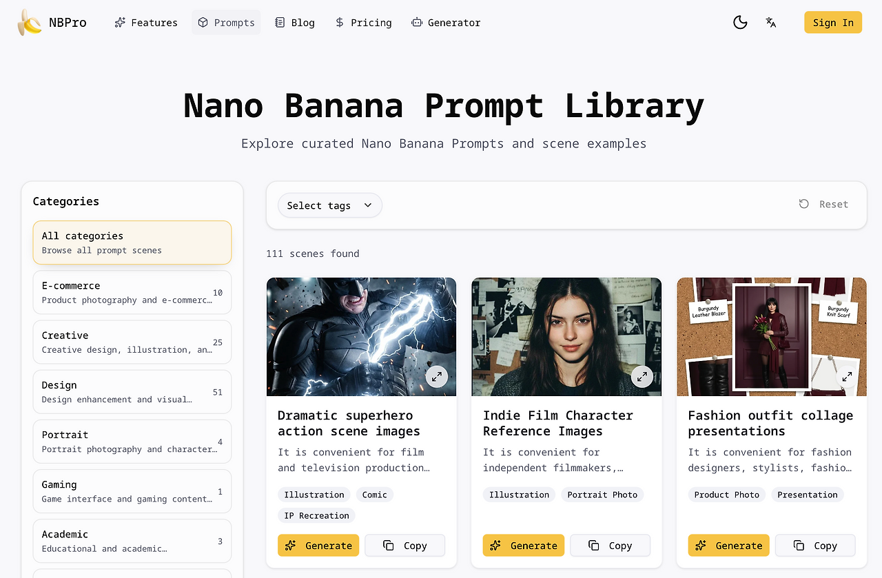 NBPro는 프롬프트 라이브러리 규모가 아주 방대하진 않지만, 유료 플랜을 이용하면 사이트 안의 생성기에서 Nano Banana Pro(표기상 Gemini 3 Pro Image) 모델로 프롬프트를 넣어 직접 이미지를 만들어볼 수 있는 점이 장점입니다. 유료 가입을 하지 않더라도 프롬프트 예시는 둘러볼 수 있어서, 다양한 형태의 이미지 생성 아이디어를 참고하기에 충분히 유용하고요. 특히 E-commerce, Design, Tools(생산성)처럼 카테고리가 잘 나뉘어 있어 필요한 영역의 프롬프트를 빠르게 찾을 수 있고, 각 예시에는 description으로 "어떤 상황에서 쓰면 좋은지"까지 설명이 붙어 있어서 그대로 따라 해보거나 내 상황에 맞게 변형하는 데 참고해 볼 수 있습니다.
