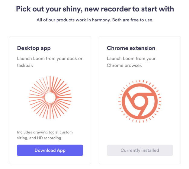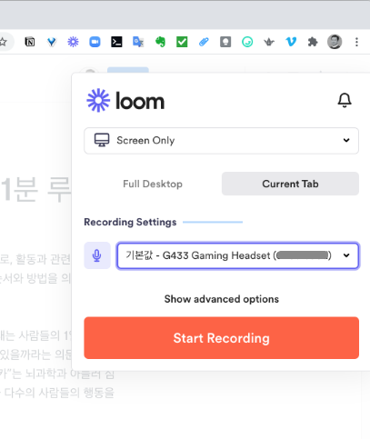 Loom을 사용하기 위해서 가장 간단한 방법은 웹브라우져 확장 프로그램을 설치하는 일입니다. 설치 후, 웹브라우져와 카메라, 마이크등이 연동된 영상 녹화를 위한 제어판이 표시됩니다. 웹브라우져 전체 혹은 특정 탭의 영상 녹화가 가능하며, 브라우져가 여러개 떠있는 경우 선택도 가능합니다. Loom의 OS별 설치형 프로그램을 설치하면, 일반 스크린녹화 프로그램 처럼 어플리케이션 화면의 영상 녹화가 가능합니다. Loom에서는 녹화 시, 강사의 얼굴이 내용과 함께 표시되도록 3단계 크기 조정이 가능하며 이를 통해 강의의 현장감을 불어넣는데 도움이 됩니다. 영상이 녹화되는 동안, 인터넷은 접속 상태가 유지되어야하며 녹화된 내용들은 계속해서 서버로 전송이 됩니다.
