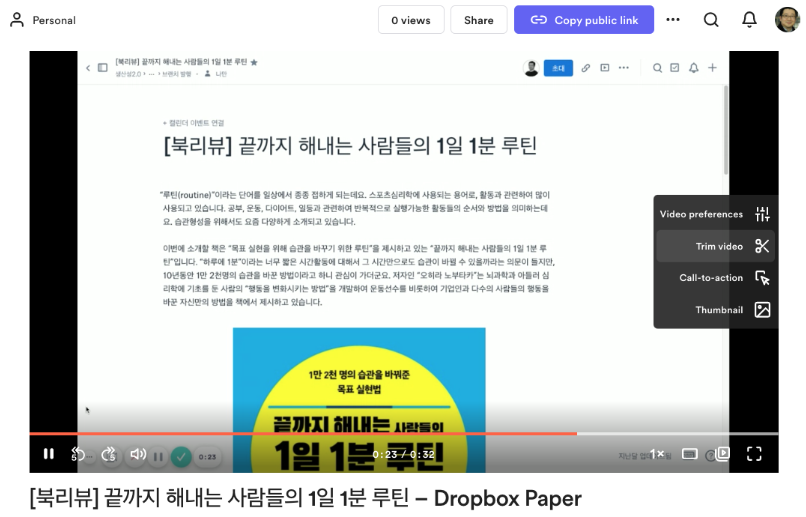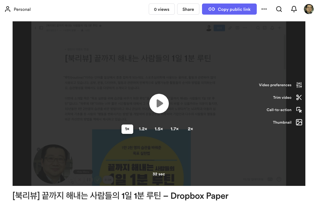 이렇게 녹화가 이루어지는 동안 업로드가 지원되어 녹화 완료 후 일반적인 긴 영상변환시간 없이도 시청이 바로 가능합니다. Loom에서는 공유될 영상의 활용성을 높이도록 영상의 상단에 영상과 관련한 링크를 클릭할 수 있는 “Call-To-Action”과 영상의 첫화면 설정을 위한 썸네일기능등을 지원하고 있으며, 공유된 영상에 댓글을 게재하는 경우 영상의 시간이 댓글에 표시되어 해당 영상의 시점으로 빠르게 이동하여 플레이해볼 수 있는 점은 매우 유용합니다.