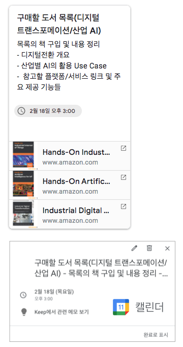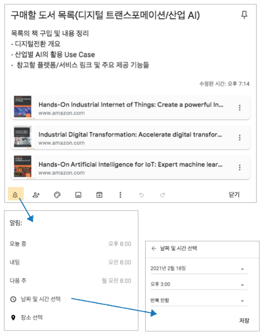 개인적으로 모바일과 PC에서 간단한 메모앱으로 Google Keep을 가장 많이 사용하고 있는데요. 할일부터 참고할 자료의 링크, 간단한 메모까지 업무에 전천후로 활용하는데 가장 유용한 것 같습니다. Google Keep에 구입할 도서목록의 링크랑 할일들을 적어두고, 알림설정에서 날짜와 시간을 설정합니다.