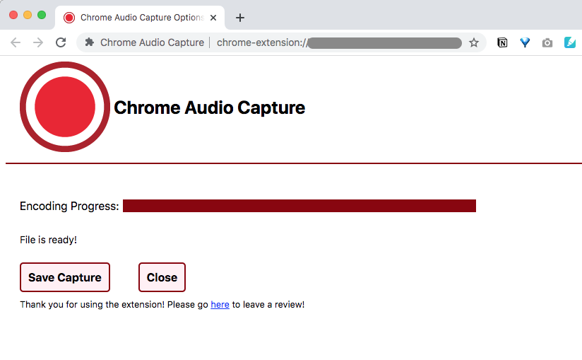 첫 번째 옵션으로, “Mute tabs that are being capture”는 오디오가 녹음되는 동안 스피커나 헤드폰으로 출력되지 않도록 설정하는 기능으로 체크를 해두면 소리는 나지 않지만 오디오 캡쳐는 진행됩니다(오디오 확인이 필요하지 않은 경우라면, 이 옵션 설정으로 조용하게 녹음할 수 있습니다). 두 번째 옵션으로 최대 20분까지 녹음 시간을 설정할 수 있습니다. 설정된 시간이 되면 녹음이 종료됩니다. 세 번째는 출력 오디오 파일의 포맷을 설정할 수 있습니다. mp3는 압축 포맷이며, wav는 비압축 포맷으로 파일의 크기가 커질 수 있습니다. 마지막으로 mp3로 오디오 파일을 저장하는 경우, 음질을 설정할 수 있습니다. 설정을 마치면, 꼭! “Save Settings” 버튼을 클릭해서 저장해 주세요.