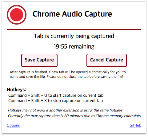 확장 프로그램 설치 후, 크롬 웹 브라우저의 상단에 있는 녹음 버튼 모양의 아이콘을 클릭하면 해당 웹 브라우저에 플레이되는 소리를 녹음할 수 있습니다. 웹 브라우저의 오프라인 저장 공간 제약으로 최대 20분까지 녹음이 가능하며, 녹음을 위한 별도 옵션 설정이 지원됩니다. 옵션은 아래와 같이 4가지 항목들에 대해 설정이 가능합니다.