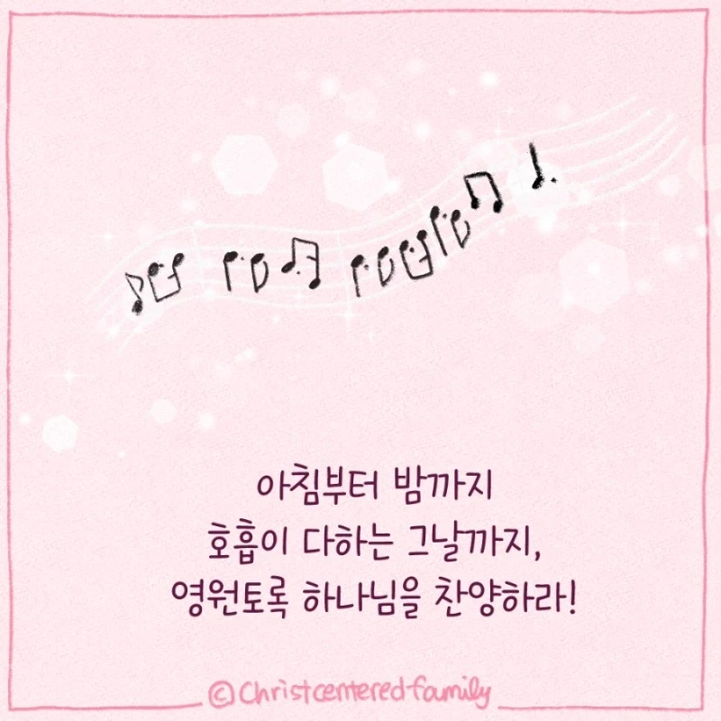 시편에서 가장 많이 나온 고백이라면, 아마도 하나님께 찬양을 올려드리며, 하나님을 찬양하라며 외치는 고백이 아닌가 생각합니다. 시편 저자들의 이 고백과도 같이 우리 삶에 날마다 하나님을 섬기며 예배함이 끊임이 없기를 원합니다. 아침마다 주의 인자하심을, 밤마다 주의 성실하심을 찬양하며, 항상 기쁨으로 하나님을 영화롭게 하는 삶이고 싶습니다.