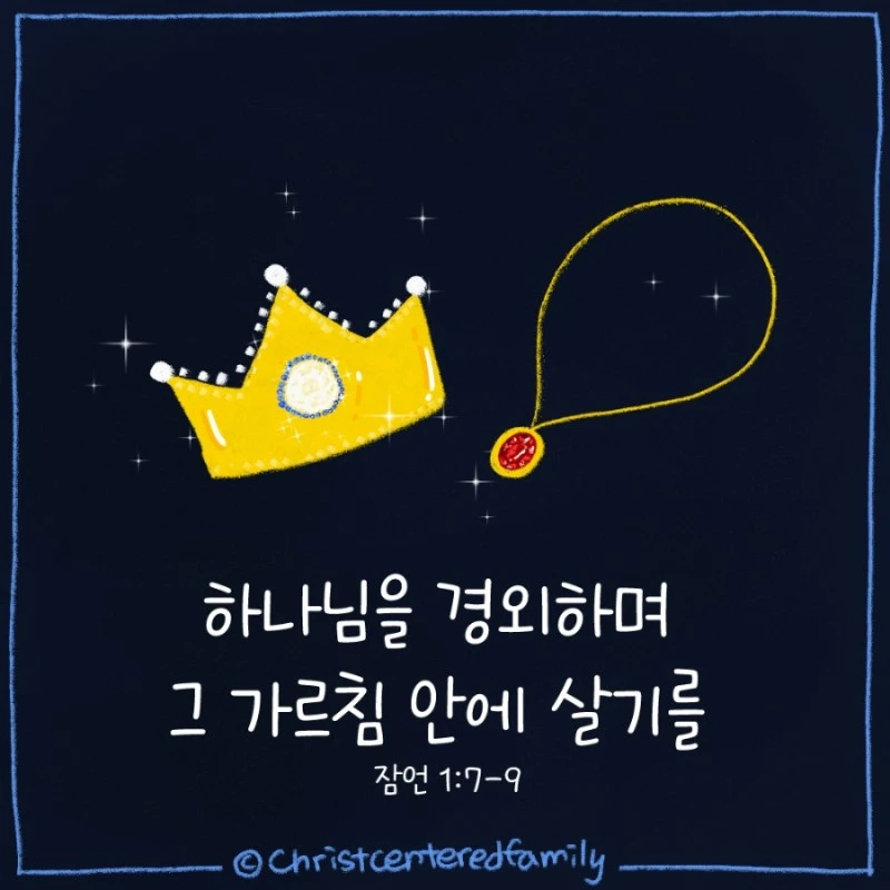 여호와를 경외하는 것이 지식의 근본이거늘 미련한 자는 지혜와 훈계를 멸시하느니라. 내 아들아 네 아비의 훈계를 들으며 네 어미의 법을 떠나지 말라. 이는 네 머리의 아름다운 관이요 네 목의 금 사슬이니라. (잠언 1:7-9)