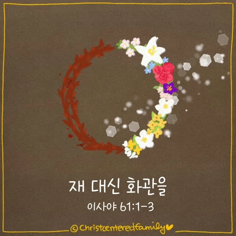 주 여호와의 영이 내게 내리셨으니 이는 여호와께서 내게 기름을 부으사 가난한 자에게 아름다운 소식을 전하게 하려 하심이라 나를 보내사 마음이 상한 자를 고치며 포로된 자에게 자유를, 갇힌 자에게 놓임을 선포하며, 여호와의 은혜의 해와 우리 하나님의 보복의 날을 선포하여 모든 슬픈 자를 위로하되, 무릇 시온에서 슬퍼하는 자에게 화관을 주어 그 재를 대신하며 기쁨의 기름으로 그 슬픔을 대신하며 찬송의 옷으로 그 근심을 대신하시고 그들이 의의 나무 곧 여호와께서 심으신 그 영광을 나타낼 자라 일컬음을 받게 하려 하심이라(이사야 61:1-3,개역개정)