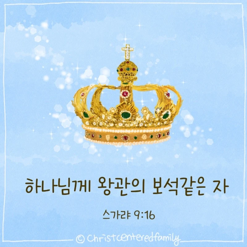 스가랴를 통해 예언된 하나님의 구원 약속을 묵상합니다. 하나님께서 하나님의 백성들을 구원하실 때, 그 백성들은 왕관의 보석 같이 하나님의 땅에서 빛날 것이라는 약속의 말씀을 믿음으로 하늘 소망으로 살아가는 인생이길 원합니다. 그 약속을 믿고 인내로 하나님 나라를 기다리며 살아가기를 기뻐하는 삶이길 소망합니다. 그리고 그 삶 가운데 날마다 우리의 삶이 하나님께 왕관의 보석과도 같이 귀하고 아름답게 평가되기를, 하나님 나라의 영원한 아름다움이 우리 안에 날마다 이뤄지기를 간절히 바라봅니다.