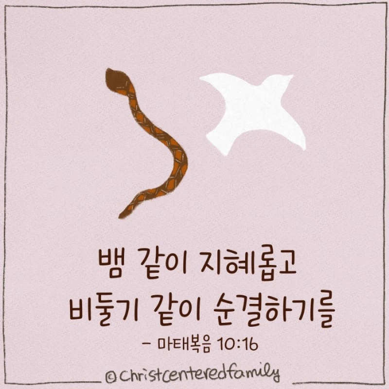 “Behold, I send you out as sheep in the midst of wolves. Therefore be wise as serpents and harmless as doves.(Matthew 10:16, NKJV) . . <오늘의 묵상> 예수님께서 제자들을 보내시며 하신 말씀을 묵상합니다. 이 세상은 마치 이리가 가득한 것과 같이 하나님의 자녀들을 공격하고 물어 뜯으려 하는 것이 가득하기만 합니다. 그러나 그 안에 하나님의 은혜로 말미암아 뱀 같이 지혜롭고 비둘기 같이 순결한 삶을 살길 원합니다. 세상의 악함을 하나님이 주신 지혜로 지혜롭게 맞서기를, 그리고 그 안에 오직 비둘기와 같이 성령의 거룩하게 하심을 잃지 않고 지내는 그리스도 안의 승리를 늘 경험하는 삶이길 소망합니다. . . <오늘의 기도> 하나님 아버지, 000(이)가 언제 어디에서나 항상 뱀 같이 지혜롭고 비둘기 같이 순결하게 하소서. 000(이)가 늘 믿음 안에 두려워 아니하며 모든 말하고 행할 바를 알려주시며 그 앞길을 인도하시는 하나님만을 바라며 지혜있는 자요, 거룩한 자로 살아가게 하소서.