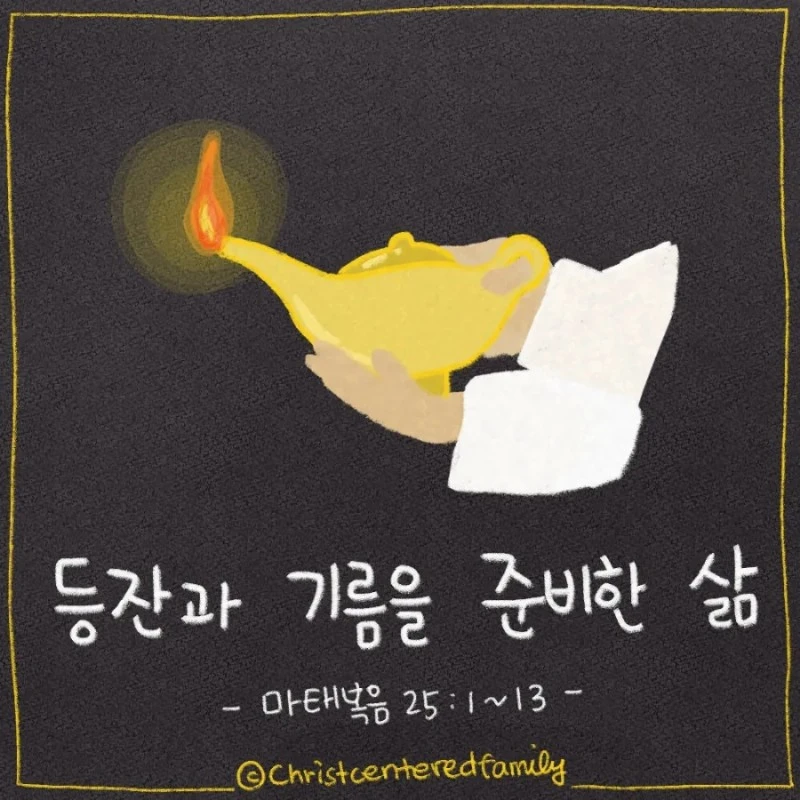 그 때에 천국은 마치 등을 들고 신랑을 맞으러 나간 열 처녀와 같다 하리니 그 중의 다섯은 미련하고 다섯은 슬기 있는 자라. 미련한 자들은 등을 가지되 기름을 가지지 아니하고, 슬기 있는 자들은 그릇에 기름을 담아 등과 함께 가져갔더니(마태복음 25:1-4, 개역개정)