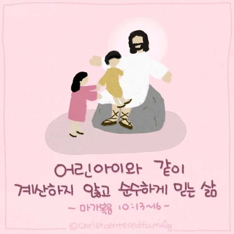 But when Jesus saw it, He was greatly displeased and said to them, “Let the little children come to Me, and do not forbid them; for of such is the kingdom of God. Assuredly, I say to you, whoever does not receive the kingdom of God as a little child will by no means enter it.” And He took them up in His arms, laid His hands on them, and blessed them.(Mark 10:14-16 NKJV) . . <오늘의 묵상> 하나님 나라를 어린 아이와 같이 받들지 않는 자는 결단코 하나님 나라에 들어가지 못하리라 하신 말씀을 묵상합니다. 우리의 삶이 어리나 나이가 드나 언제나 항상 변함없이 어린아이와 같이 순전히 하나님을 믿기를, 순수한 마음으로 하나님 나라를 믿고 따르는 삶이기를 원합니다. 세상의 잣대나 나의 이기적인 마음으로 판단하고 계산하며 믿는 믿음이 아니라, 순수하게 믿음으로 하나님의 말씀만 따라가는 그러한 삶을 평생 살길 소망합니다.
