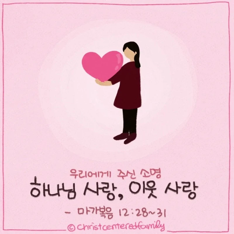 예수님께서 말씀하신 가장 큰 두 계명을 묵상합니다. 하나님을 사랑하며, 이웃을 사랑하라고 명하신 그 계명을 온전히 삶 속에 지키는 매일되기를 소망합니다. 우리를 지으시며 구원하신 하나님을 온 마음을 다하고, 온 힘과 정성을 다하여 사랑하기를, 그리고 우리를 사랑하신 그 사랑으로 우리 주위의 이웃을 사랑하여 하나님의 기뻐하시는 뜻을 날마다 온전히 이루는 삶이기를 소망합니다.