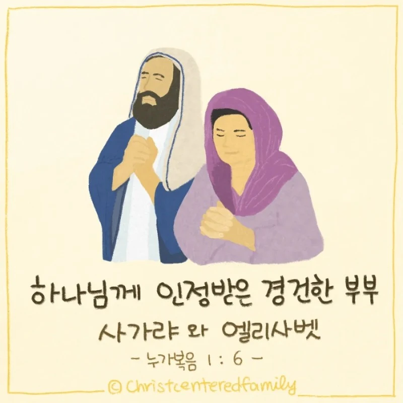 유대 왕 헤롯 때에 아비야 반열에 제사장 한 사람이 있었으니 이름은 사가랴요 그의 아내는 아론의 자손이니 이름은 엘리사벳이라. 이 두 사람이 하나님 앞에 의인이니 주의 모든 계명과 규례대로 흠이 없이 행하더라. (누가복음 1:5-6, 개역개정)