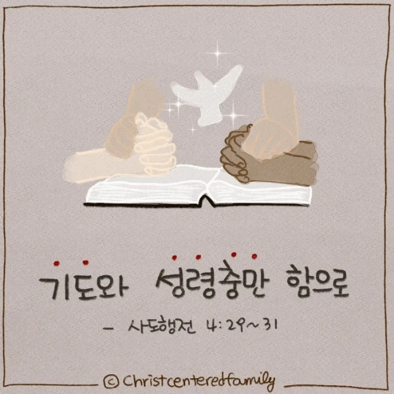주여 이제도 그들의 위협함을 굽어보시옵고 또 종들로 하여금 담대히 하나님의 말씀을 전하게 하여 주시오며, 손을 내밀어 병을 낫게 하시옵고 표적과 기사가 거룩한 종 예수의 이름으로 이루어지게 하옵소서 하더라. 빌기를 다하매 모인 곳이 진동하더니 무리가 다 성령이 충만하여 담대히 하나님의 말씀을 전하니라(사도행전 4:29-31, 개역개정)