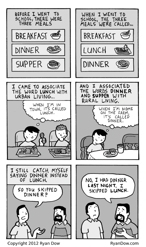오늘날 우리가 일반적으로 알고 있는 삼시세끼에 관한 명칭은 Breakfast-Lunch-Dinner입니다. 그러나 사실 이 명칭은 20세기 중반 이후 미국의 도시 문화를 중심으로 통용된 표현이었고, 그 이전까지 주로 사용하던 표현은 바로 Breakfast-Dinner-Supper(또는 Tea) 였습니다.