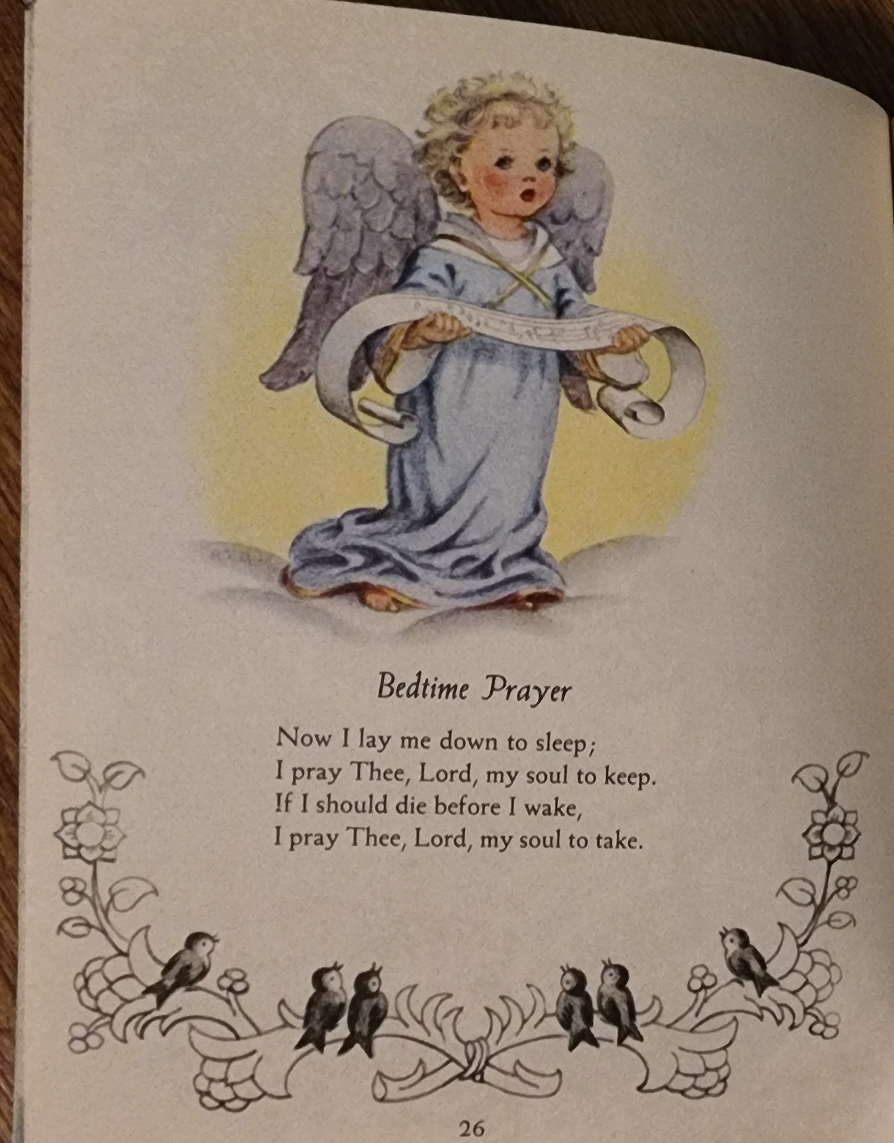 실제로 이 기도문은 1945년에 출판된 어린이 기도서에서도 여전히 대표 잠자리 기도문인것을 고려할때 아마도 그 당시에도 여전히 이 버전의 기도문으로 아이들 기도를 하지 않았을까 생각합니다.
