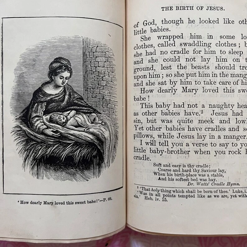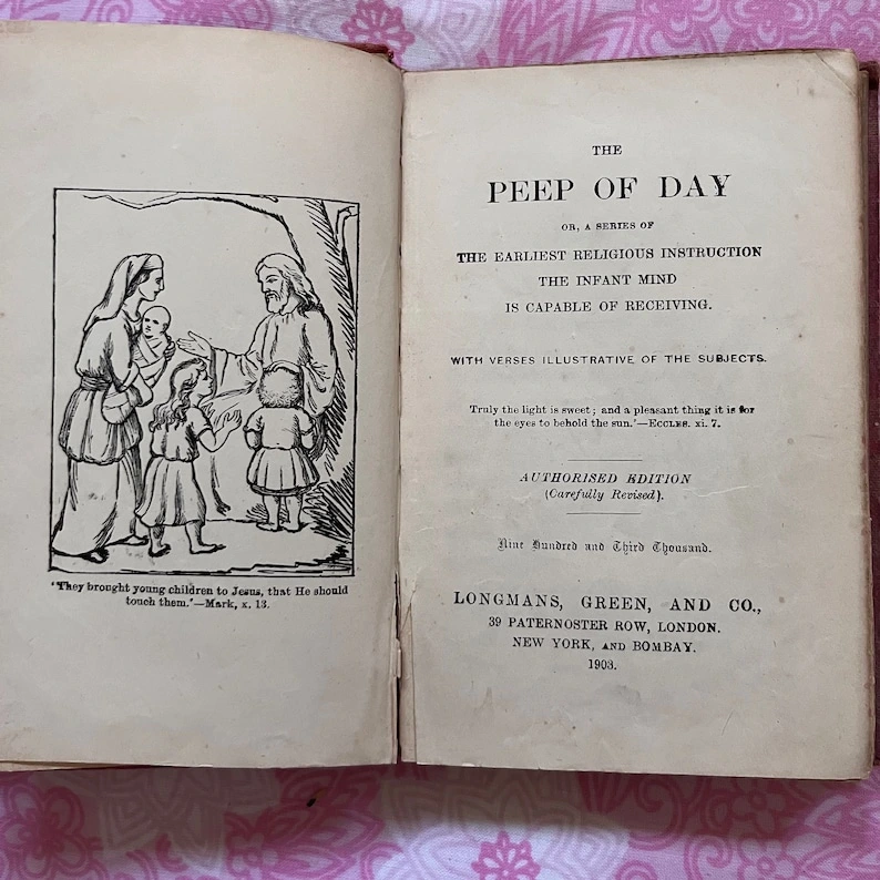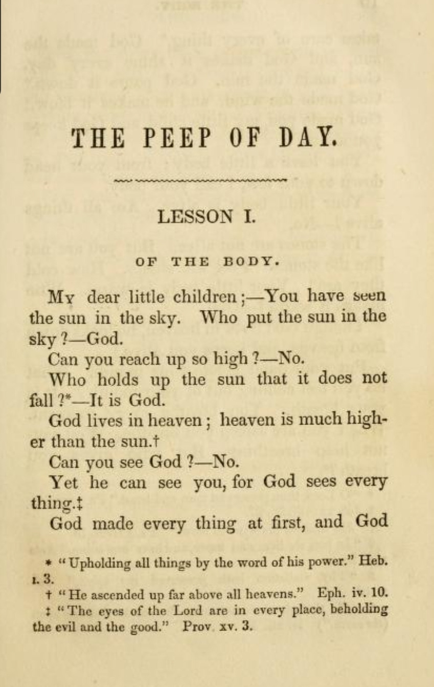 이는 19세기부터 지금까지 쭉 오래 사랑받아온 영국계 개신교 어린이 교리교재인 <The Peep of Day; Or, A Series of the Earliest Religious Instruction the Infant Mind is Capable of Receiving. With Verses Illustrative of the Subjects(1817)> 를 뜻합니다.