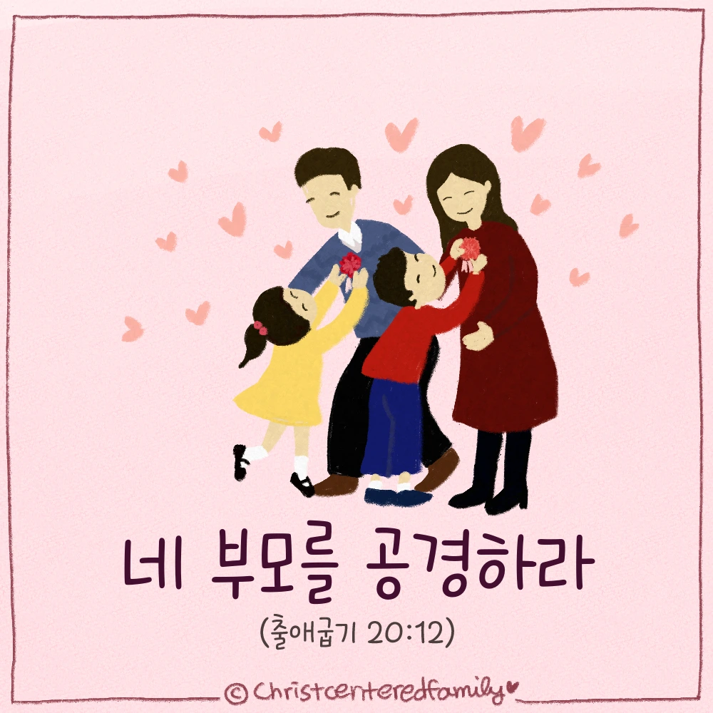 사람들을 향한 계명 중 첫 계명인 '네 부모를 공경하라'는 말씀을 묵상합니다. 신약에서는 약속이 있는 첫 계명(에베소서 6:1~3)이라 설명하기도한 '부모를 공경함'이 늘 삶 속에 거룩하게 지켜지기를 원합니다. 우리를 태중에 품으시고 출산하신 부모님, 우리를 길러주신 부모님을 하나님의 사랑으로 공경하고 사랑하기를, 그래서 그리스도의 법이 성취된 거룩한 가정으로 세워지길 소망합니다.
