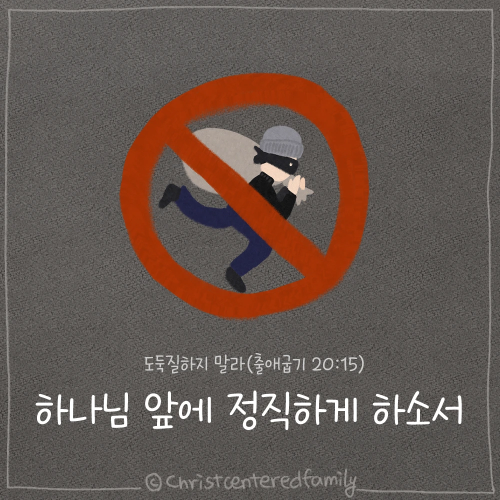 도둑질하지 말라는 말씀을 묵상합니다. 하나님께서 우리에게 허락하신 것 외에 남의 것을 함부로 가로채려하지 않길 원합니다. 그것이 물질이든, 업적이나 공과, 직업, 아이디어 등 모든 면에 있어서 하나님 앞에 정직하게 남의 것을 빼앗아 가지려 하지 않길 원합니다. 오직 공의로우시며, 정직하신 하나님의 성령이 우리 안에 늘 가르쳐주시는대로, 모든 면에서 도둑질하지 않는 삶. 정직하고 성실하며, 겸손한 인생되길 원합니다.