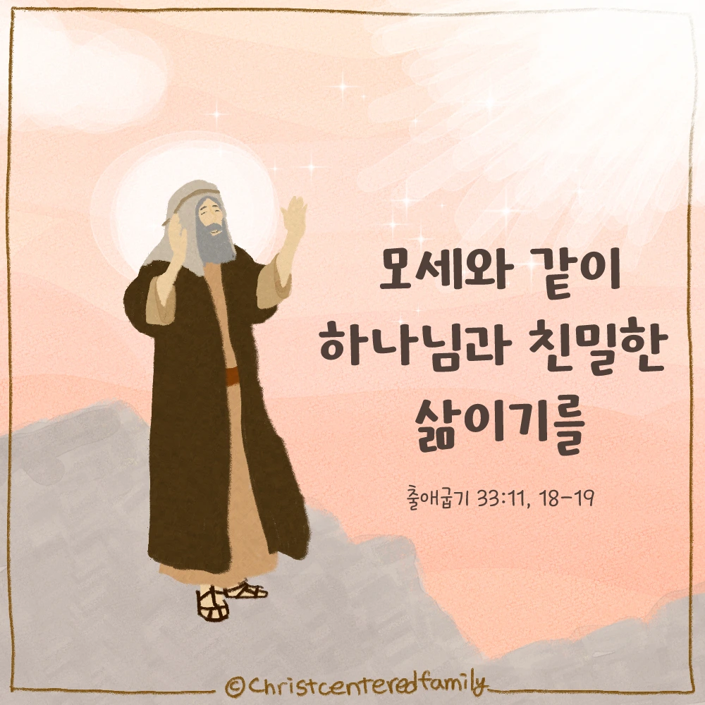모세와 같이 하나님과 날마다 더 친밀해지고 가까워지기를, 그래서 매일의 삶 속에 하나님의 영광을 보며 그 안에 날마다 은혜가 충만한 삶이기를 간절히 소망합니다. 하나님과 친밀하여, 우리를 통해 날마다 하나님의 빛이 증거되기를, 세상에 하나님이 살아계심을 증거하며, 하나님을 경외하는 삶으로 초대하게 되는 그러한 거룩한 친밀함을 늘 사모하며 살길 원합니다.