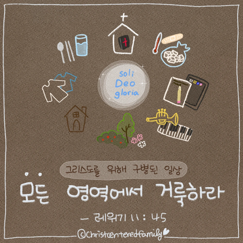 '거룩'은 곧 하나님의 말씀대로 모든 영역에서 말씀에 순종하여 살아가는 것을 뜻합니다. 예배도, 일상 생활의 영역에서도, 모든 영역에서 말씀대로 살아가는 삶을 뜻합니다. 오늘 우리의 삶도 그러하기를 원합니다. 모든 의식주의 생활, 소셜 미디어에 올려지는 모습이나, 나의 여가시간, 나의 업무나 개인 여가 시간, 아플 때나 건강할 때나, 인간 관계에서 모든 상황에 있어서 하나님의 뜻을 구하고 그 뜻대로 행하는 그러한 구별됨이 있기를 원합니다. 모든 순간 속에서 내 생각이 앞서지 말게 하소서. 문화적으로 당연하고 타당한 것을 따르기보다, 하나님이 이 순간 무엇을 원하실까, 무엇을 기뻐하실까를 생각하며 거룩의 길을 가는 우리의 삶이길 원합니다.
