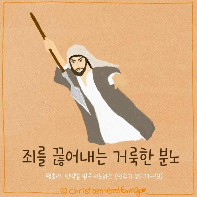 비느하스의 거룩한 분노를 묵상합니다. 비느하스는 이스라엘 백성들의 죄악이 가득차 하나님의 심판이 임하려할 때, 하나님을 위해 거룩한 분노를 가지고 죄악을 끊어내고자 했습니다. 하나님을 위하여 질투하고 분노한 비느하스는 그 가문이 영원히 제사장이 되게 하겠다는 놀라운 은혜와 평화의 언약을 받게 되었음을 봅니다.