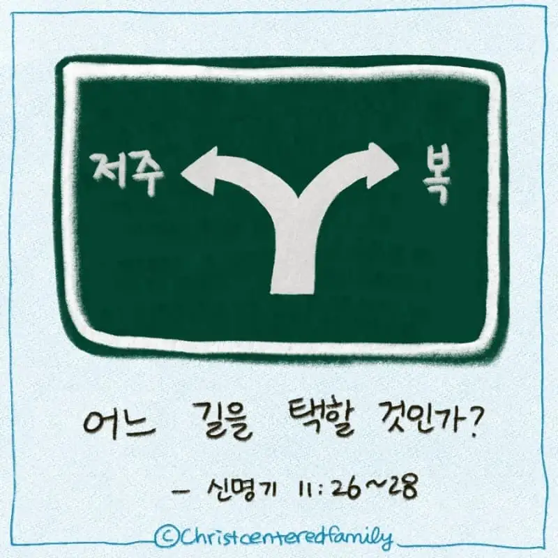 “Behold, I set before you today a blessing and a curse: the blessing, if you obey the commandments of the Lord your God which I command you today; and the curse, if you do not obey the commandments of the Lord your God, but turn aside from the way which I command you today, to go after other gods which you have not known. (Deuteronomy 11:26-28 NKJV) . . <오늘의 묵상> 우리 앞에 복과 저주의 길을 두셨다 말씀하신 이 말씀을 평생에, 매 순간에 기억하며 살길 원합니다. 늘 우리를 무너뜨려 저주의 삶으로 이끌려 하는 죄의 유혹 앞에서 이 말씀을 기억하며 오직 말씀에 기록된 대로 순종의 길을 따라가길 원합니다. 그래서 가장 사소한 삶의 순간에서조차 늘 하나님의 말씀을 따라 복의 길을 선택하는 그러한 믿음의 여정이고 싶습니다. . . <오늘의 기도> 창조주 하나님, 000가(우리 가정이) 하나님의 말씀에 순종함으로 복의 길로 가는 인생이게 하소서. 가장 사소한 순간에서라도 순종하여 그 모든 순간이 복이 되게 하소서.