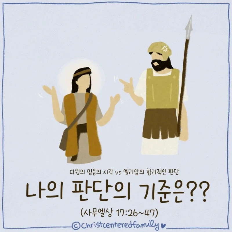 블레셋이 이스라엘을 공격하여 쳐들어왔을 때, 거인 장수 골리앗을 보고 반응하던 이스라엘 사람들과 다윗의 모습을 비교하여 묵상합니다. 이스라엘의 모두는, 다윗의 형인 엘리압을 비롯하여 모두가 현실적으로 볼 때, 전략적으로 열세라 이스라엘은 그들의 적수가 되지 못한다 평가했습니다. 그러나 다윗은 현실적인 조건의 눈이 아닌 믿음의 눈으로 모든 상황을 봤습니다. 무엇보다 하나님 나라의 관점에서, 하나님의 영광의 관점에서 모든 것을 보고 판단했습니다.