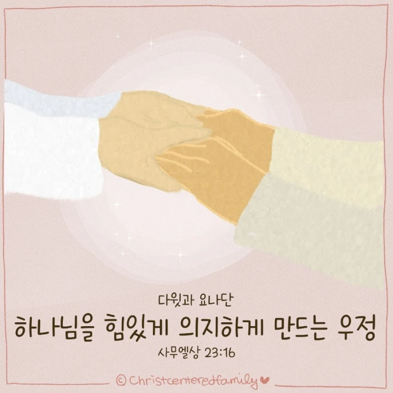 다윗과 요나단에 관한 말씀을 묵상합니다. 다윗이 위기에 처한 순간 요나단은 다윗이 힘 있게 하나님을 의지하게 했다고 기록된 말씀을 묵상합니다. 믿음의 친구는 친구의 믿음을 더욱 굳세게 합니다. 믿음의 친구는 하나님께로 그 시선을 향하게 합니다. 오늘 우리에게, 우리 자녀에게 이런 믿음의 친구가 있기를, 또한 우리가 누군가에게 그런 믿음의 친구되기를 소망합니다. 그래서 우리 주 예수 그리스도 안에 주님 다시 오실 그날까지, 우리의 호흡이 다 하는 날까지 함께 하나님 나라를 위해 거룩하게 지어지기를 간절히 바라봅니다.