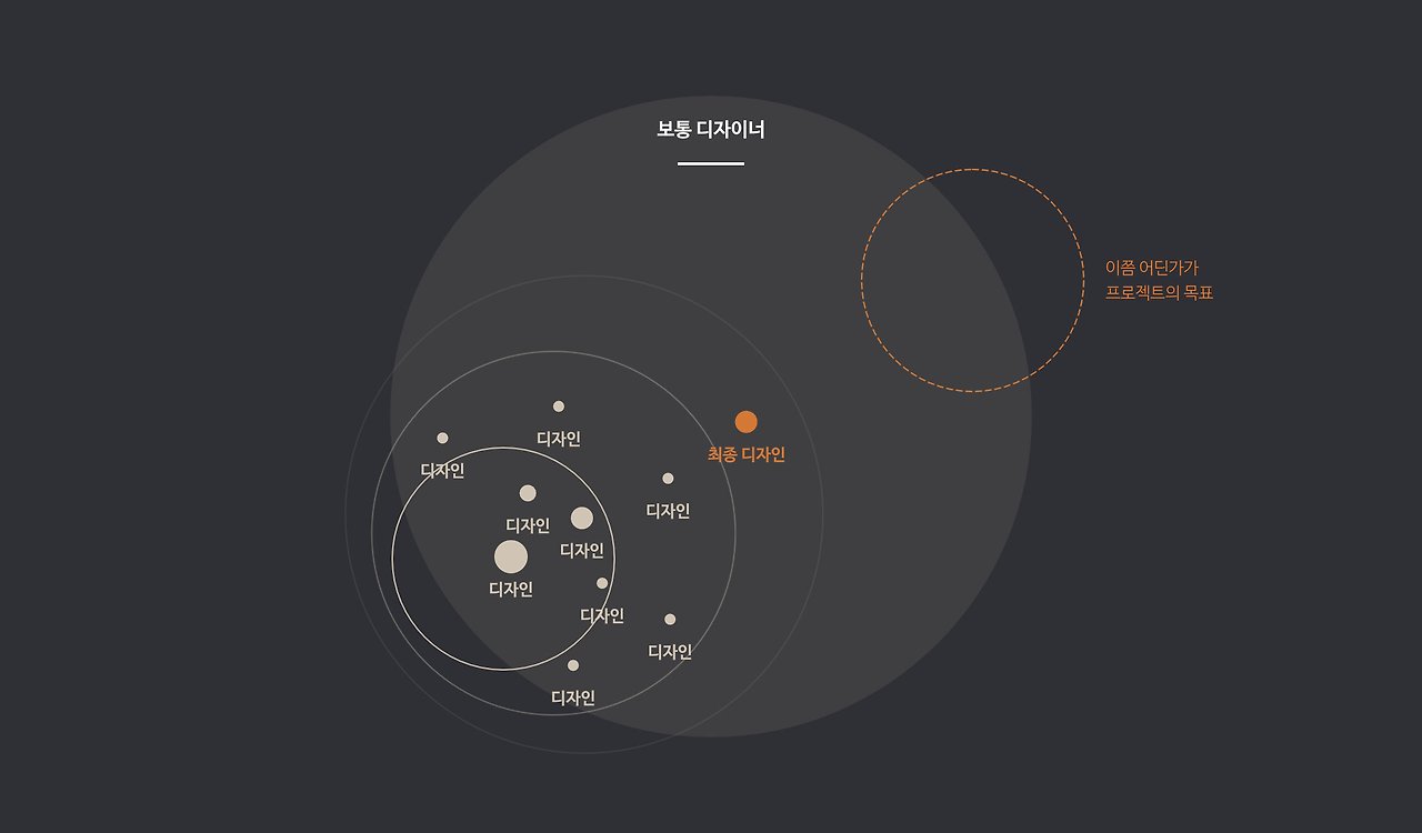 프로세스 없이 감으로 디자인하는 보통의 디자이너는 디자인을 열심히 만들어한다. 프로젝트 목표를 향해서 계속해서 디자인을 하지만, 좋은 결과를 얻는 것은 힘들다.