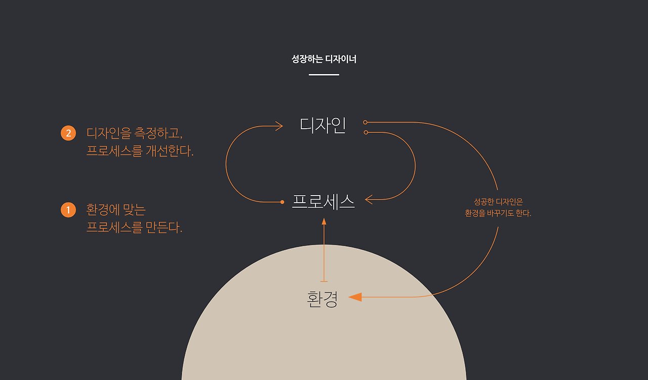 그래서 디자이너는 어떤 프로세스로 디자인하고 있는지 알아야 한다. 프로세스에 기반하는 디자이너의 디자인은 디자이너의 취향에 따른 영향을 적게 받는다. 그래서 논리적이고 측정 가능하며, 개선할 수 있다.