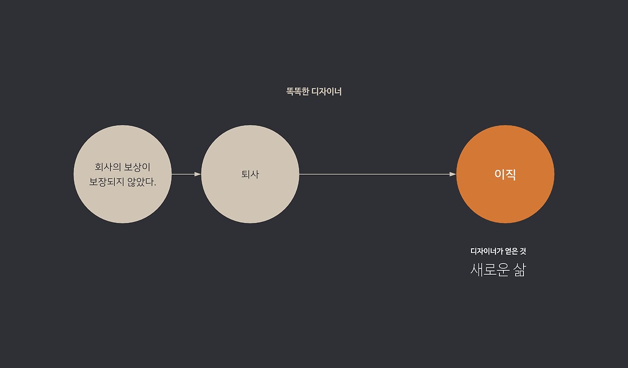 똑똑한 디자이너는 보상이 보장되지 않으면, 퇴사한다. 시간낭비를 하지 않고, 자신에게 맞는 환경을 찾아서 떠나 새로운 삶을 찾지만, 리스크도 크다. 구직 기간이 길어지는 경우, 자존감의 상처를 입기도 한다. 하지만 이직에 성공하고 연봉을 올리고, 더 좋은 환경에서 일하게 되는 경우가 많다.