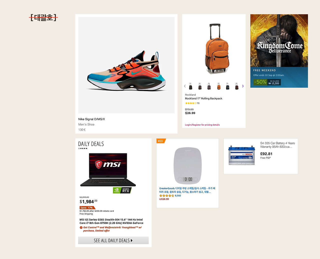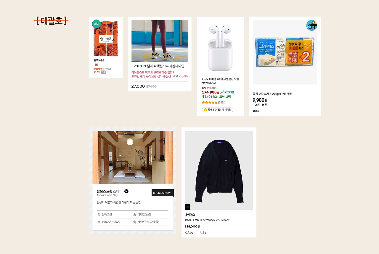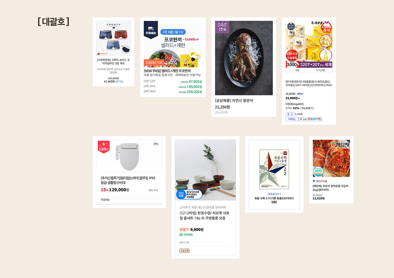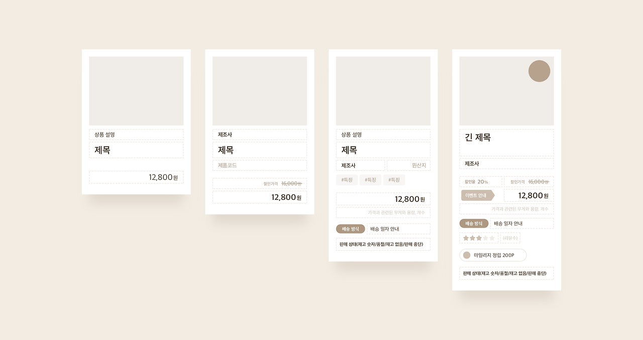 온라인 쇼핑몰에서 보편적인 네모칸의 형식이다. 이제 디자인을 하라고 하면, 사진의 크기와 비율, 둥근 사각형, 배지나 아이콘의 디자인을 열심히 조정하려고 할 것이다. 각 항목의 크기와 배열 순서가 달라질 수도 있다.