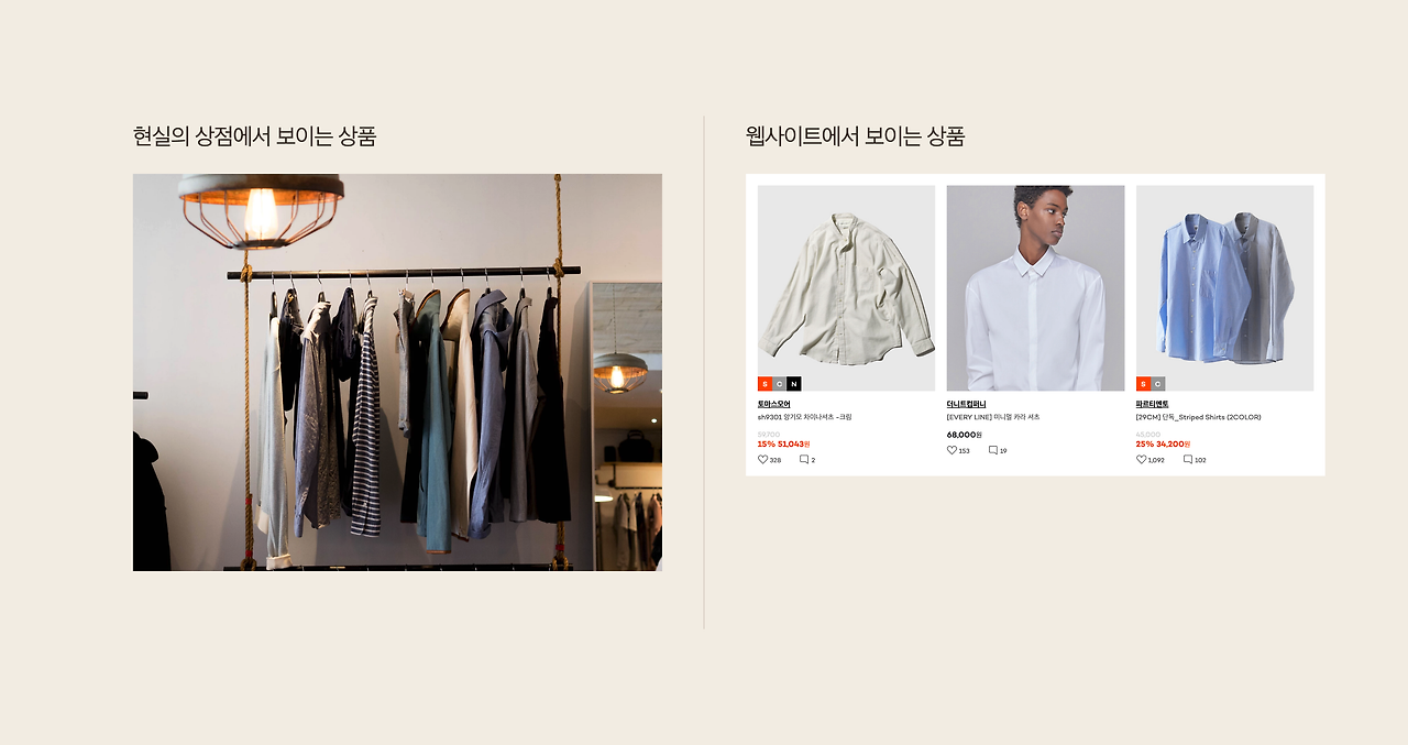 현실의 옷가게에 들어가면, 옷이 잔뜩 걸린 매대 사이를 걷게 된다. 온라인 쇼핑몰에서는 옷의 사진과 꼬리표의 정보를 한 번에 보게 된다. 양쪽 모두 옷을 사지만, 한쪽은 진짜 옷을 만져보거나 입어본 후에 가격과 이름을 알게 되고, 다른 한쪽은 세부 정보를 알거나 입어보기 전에 가격과 이름부터 보게 된다.