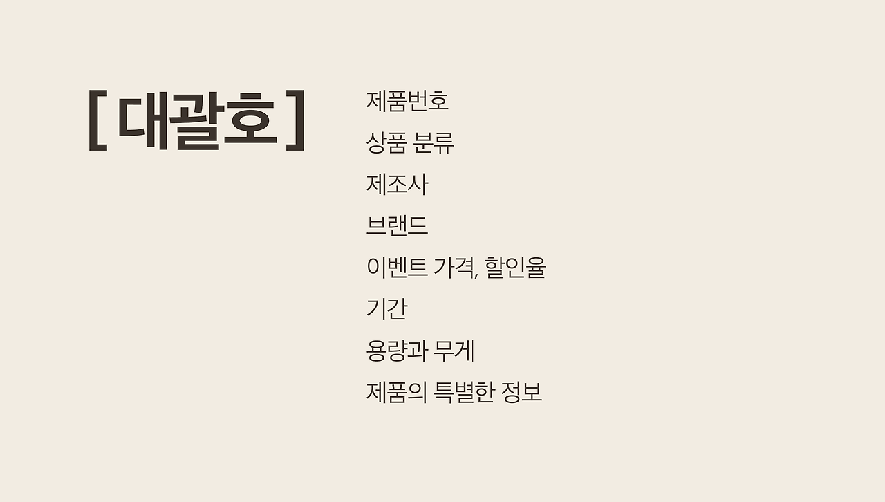 대괄호는 텍스트 위주의 사전에서 많이 사용된 기호로 사전에서는 텍스트와 다른 정보를 구분할 때 사용한다. 전문 용어나 분류 같은 것을 구분하여 보여줄 때 사용한다. 요즘은 쇼핑몰에서 자주 볼 수 있다. 그런데 쇼핑몰을 보다가 보면, 상품의 제목에 [대괄호]가 있는 쇼핑몰과 제목에 [대괄호]가 없는 쇼핑몰이 있다.
