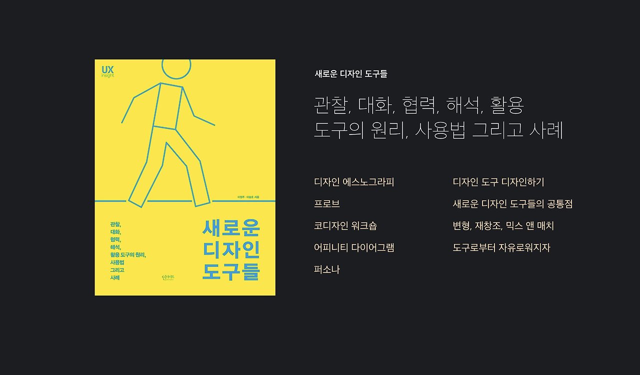 새로운 디자인의 도구는 디자인의 도구를 소개하고 의미와 용도, 활용 방식에 대해서 압축적으로 설명한다. 원리를 이해하지 못하고 도구의 형식적인 측면만 반복한다는 생각이 들면, 꼭 봐야하는 책이다. 이 책은 도구를 사용하는 방법에 있어서 꼭 지침만 따를 필요는 없으며, 새로운 도구들을 만드는 방법에 대한 조언도 하고 있다.