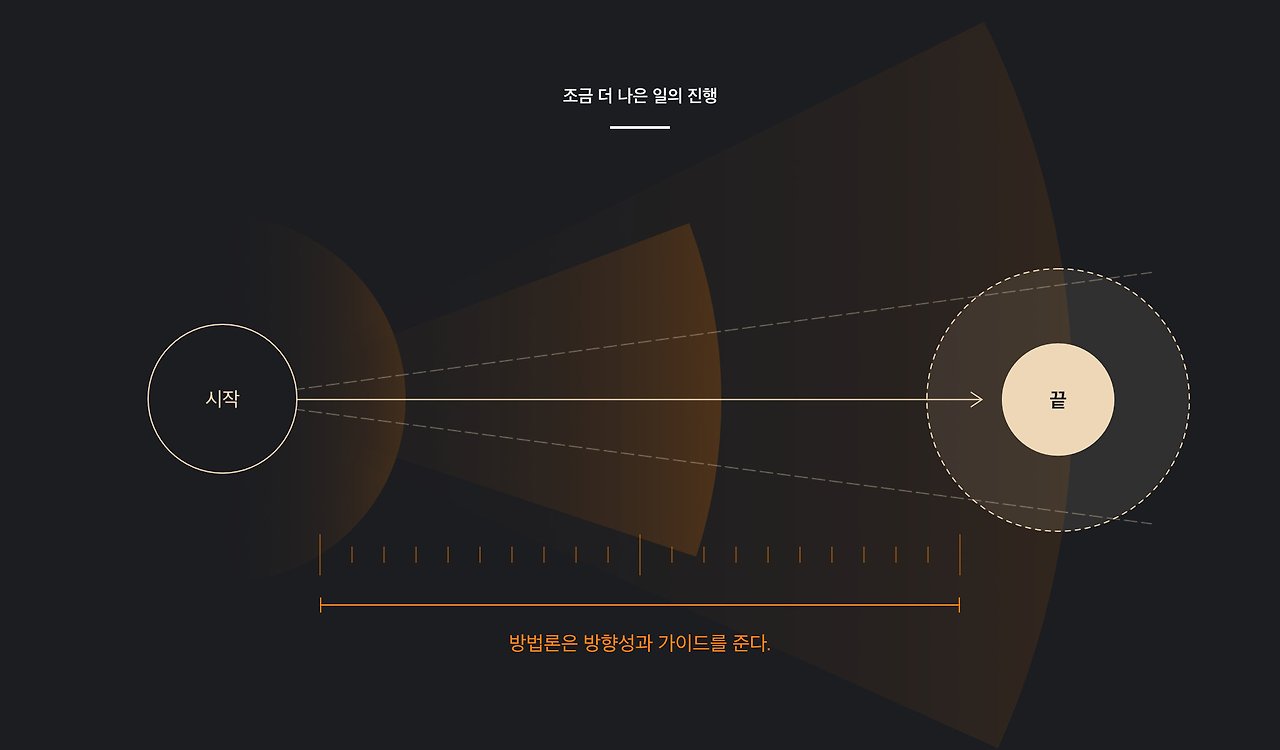 하나의 팀이 피그마처럼 공통의 도구를 사용하는 것이 더 나은 효과를 낸다면, 방법론은 도구의 사용법을 보완하고 발전시키는 보이지 않는 도구로 작동한다.