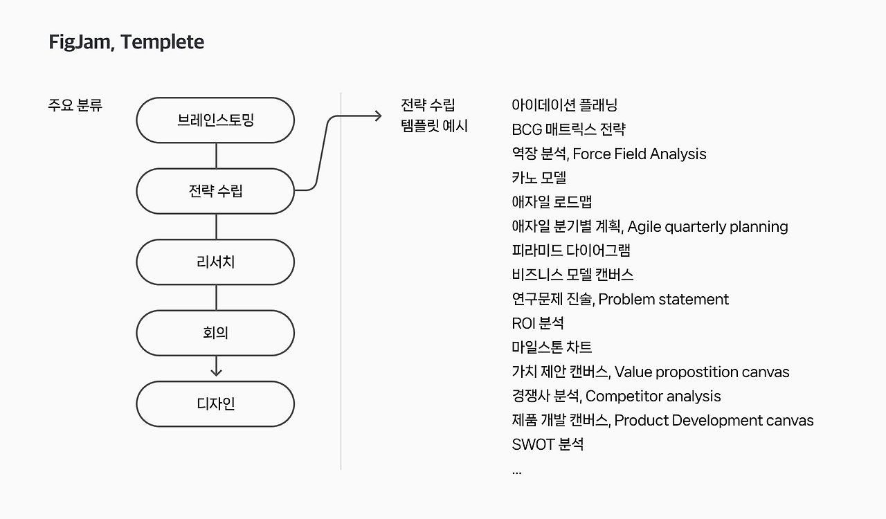 피그마 웹사이트에서 템플릿을 살펴보면, 분류에 따라 다양한 템플릿이 있습니다. 알려져 있는 거의 모든 다이어그램과 방법론 도식을 확인할 수 있었습니다.