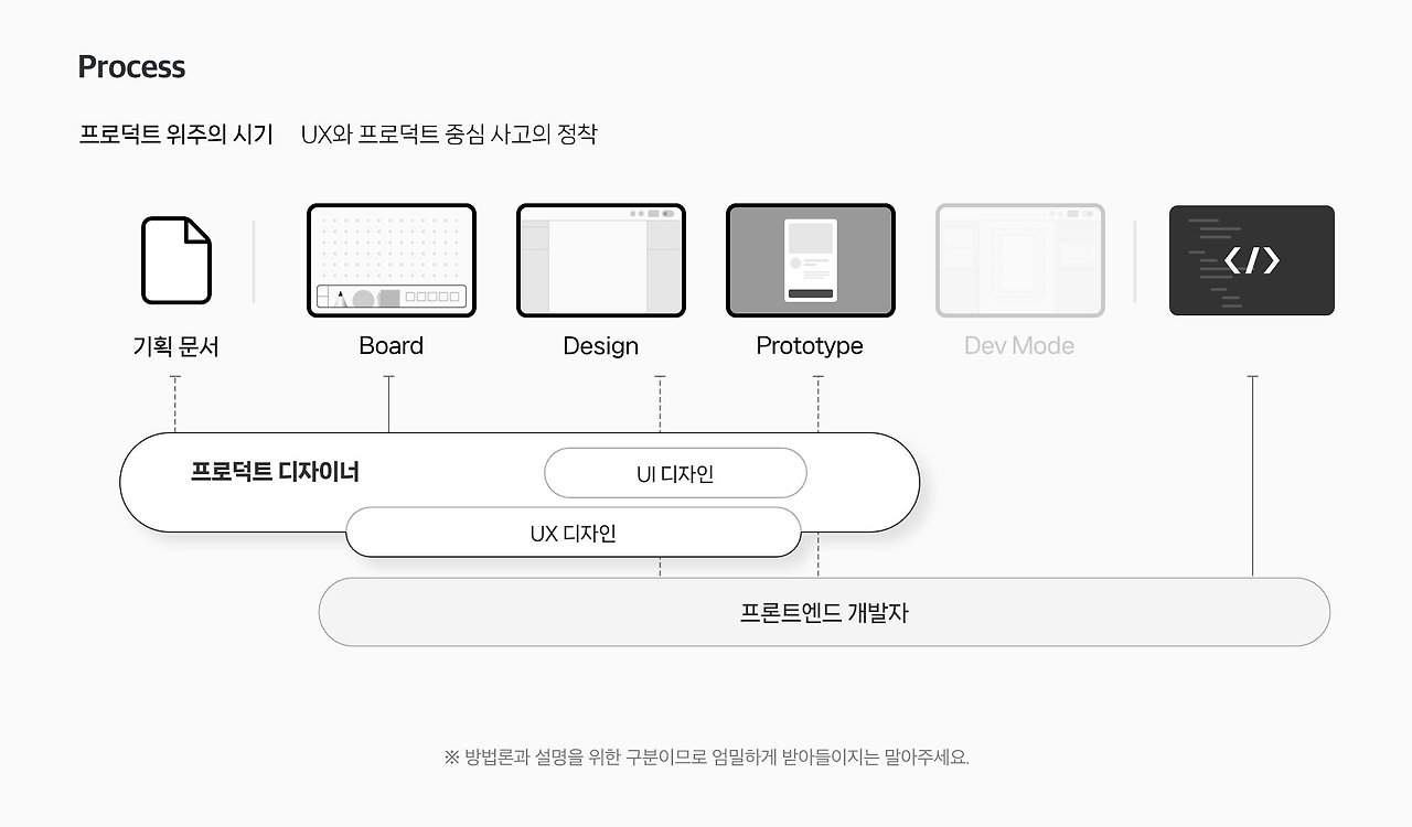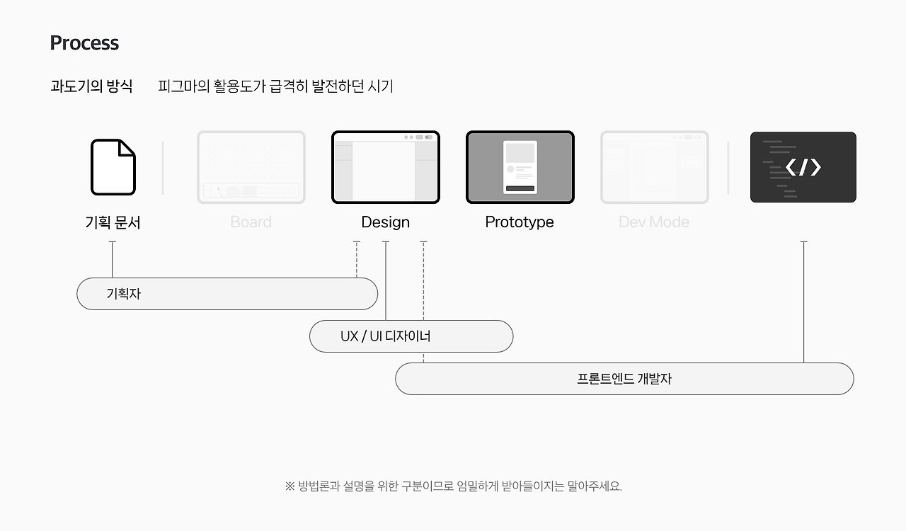 플랫폼 관점에서 피그마의 각 영역을 Board, Design, Prototype, Dev Mode로 나누어 업무 절차에 대입하여 보았습니다.