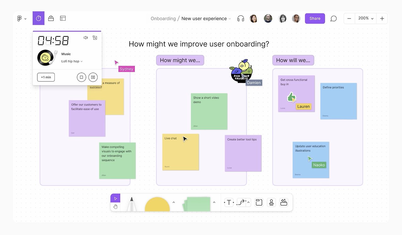 FigJam은 가상의 화이트보드로 서비스, 제품, 시스템의 설계와 아이디어 발상에 유용한 템플릿을 제공하는 온라인 화이트보드입니다. 가상의 공간을 활용하면, 포스트잇으로 벽을 도배하지 않아도 되고, 아이디어와 콘셉트를 스케치하기도 쉽습니다.