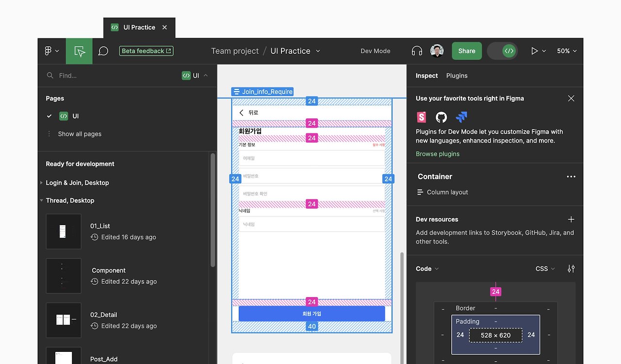 2023년 하반기에는 디자인 부분에 Dev Mode가 추가 되었습니다.