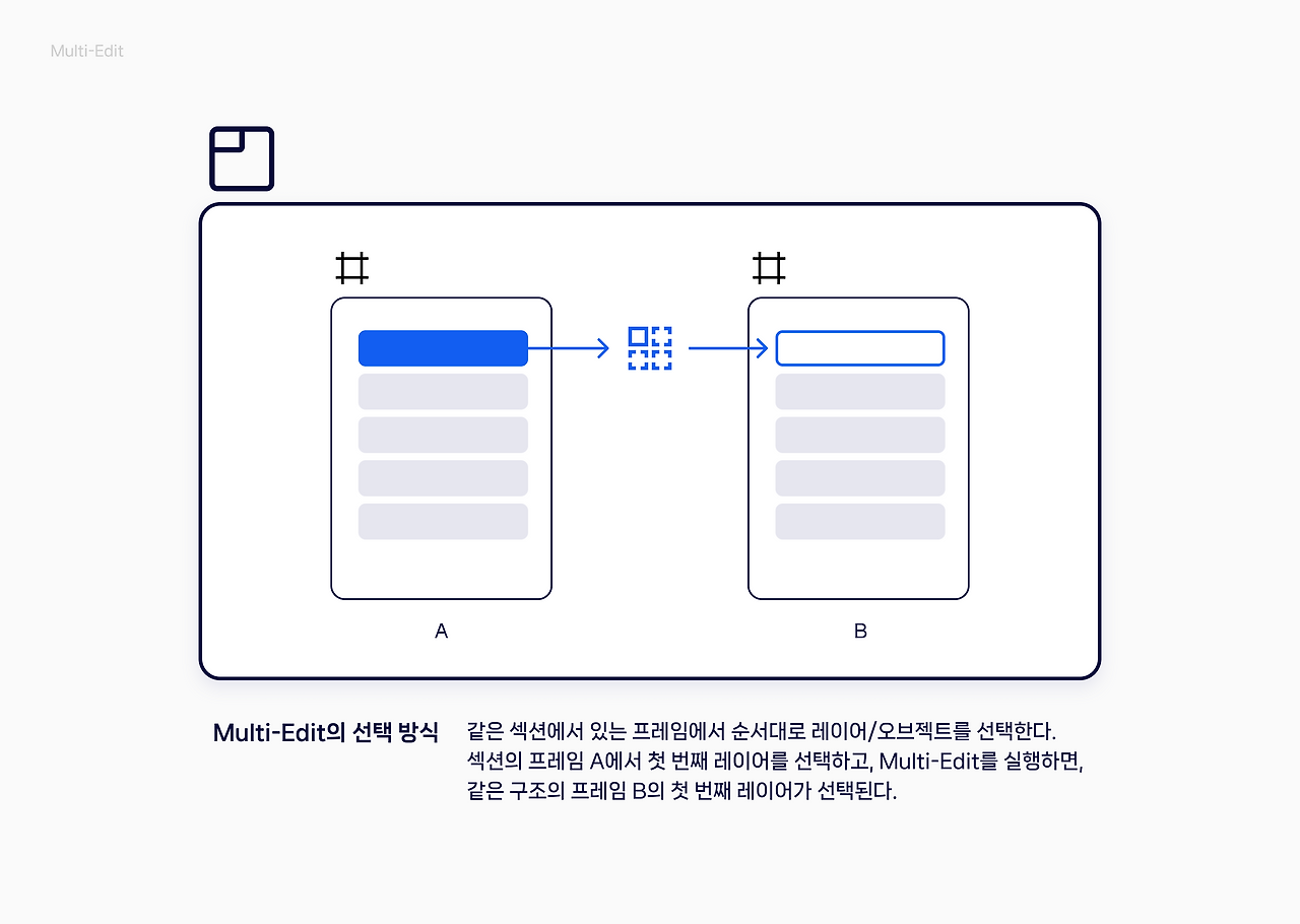 Multi-Edit는 프레임 기준으로 작동하고, 상위 컨테이너로는 섹션만 인정합니다. 이 기능을 활용하기 위해서는 같은 뎁스에 같은 이름을 가진 구조가 필요합니다.