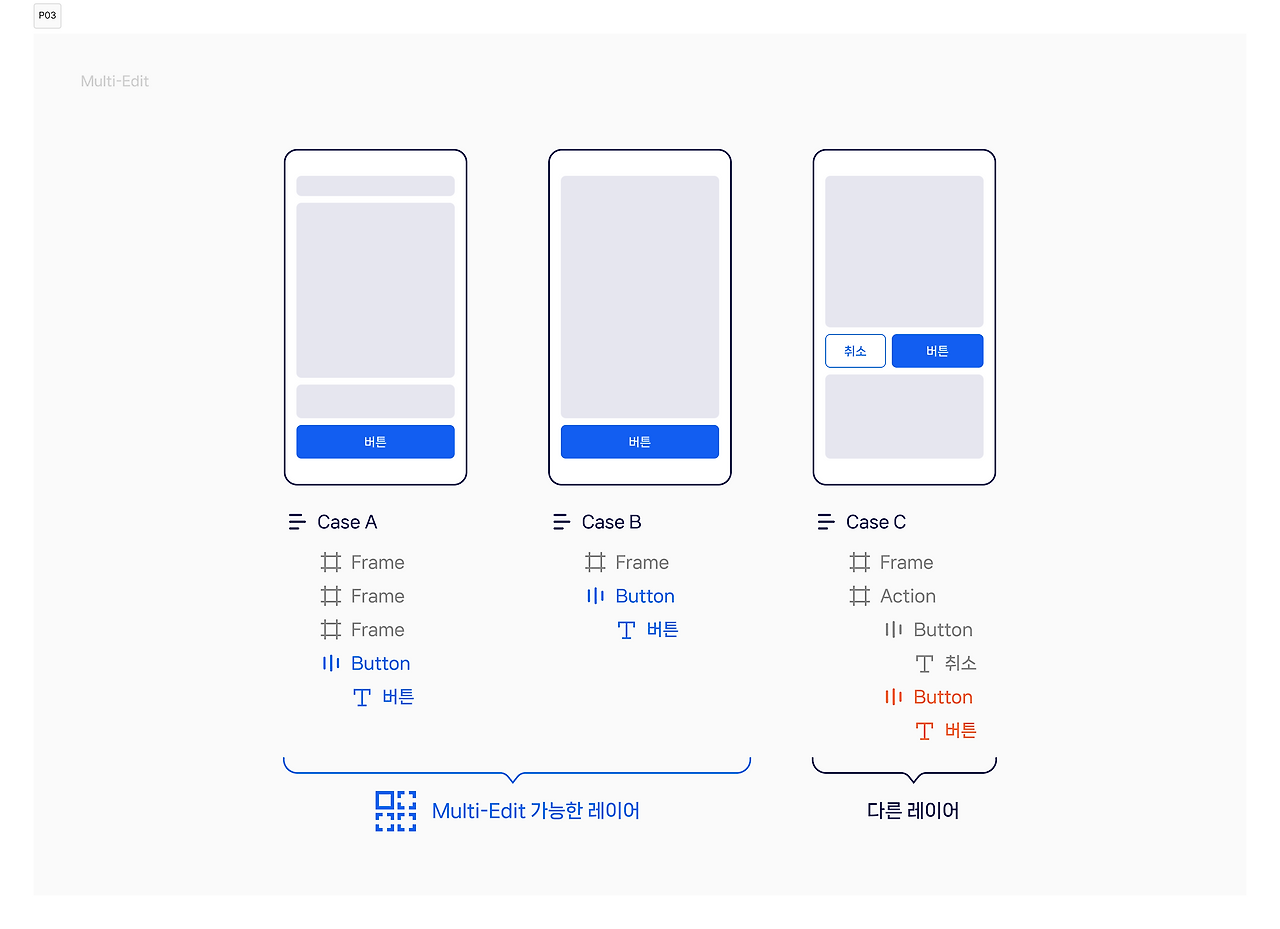 그런데, Case C의 경우는 컨테이너가 하나 더 있어서 Multi-Edit로 선택되지 않습니다. 프레임의 이름이 바뀌어도 선택되지 않습니다. 일단 선택이 되면, 색과 크기, 순서부터 오토 레이아웃 기능까지 더 효과적으로 쓸 수 있습니다.